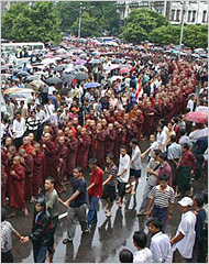 I feel bad to say it, but it looks like we'll be living another ten years with the military in control of Burma. Unfortunately for lack preparedness or an ability to connect to the outside world, the Burma protests fell well short of the push needed for any kind of real change. Unfortunately not enough images like this made it out of the country. Burma, maybe when your internet is restored you can read some tips, on staging an effective protest :Have signs, lots of signs, and make them two-sided. Remember, photographs are visual things. For the most part, one group of people yelling and shaking their fists looks the same as another. So if you want your message to get across in print, you need some kind of recognizable symbol in the picture. I'm not suggesting that you should walk up to the photographer and show them your sign, but if you're there waving it about, you want to give the media a chance to capture it. Making two-sided signs helps.