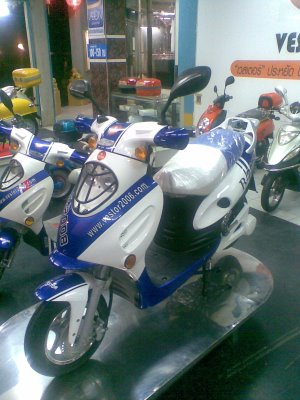 Thanks to the Chinese, you can now buy an Electric motorcycle in Thailand. These silent savers come in at 800 and 1200 watts. A charge of 6-8 hours gets you 70-80 km of travel. Top speed about 40 km/h. The model shown is a Vestor-b 2008 and runs 38,500 Baht. One that looks more like a Honda Dream comes in at 36,500 Baht. Check out the Vestor.The only problem seems to be the main dealership is in Mukdahan.