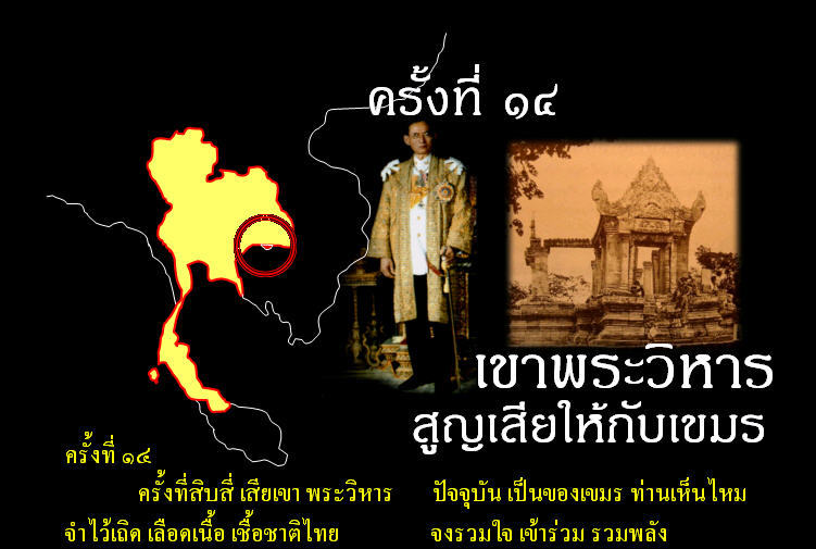 In one of many frames you can see the area given away, and the king who was in power at the time. This one depicts loosing the Lao and Cambodian regions.The last frame depicts the current loss of land, that has led to this latest step down by the Foreign Minister.