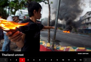 The Red leaders were fools not to jump for the face saving offer of a Nov. 24 election, and things have deteriorated since, as I guess someone wants them to. Presumably not Kattiya any longer, though until his shooting, he was the one I thought most likely to want to push for a more violent escalation, and the most capable of inspiring and leading such a move by the Reds, as shown by his intemperate raid on Chula. Hospital and the subsequent conflicts with other Red leaders.