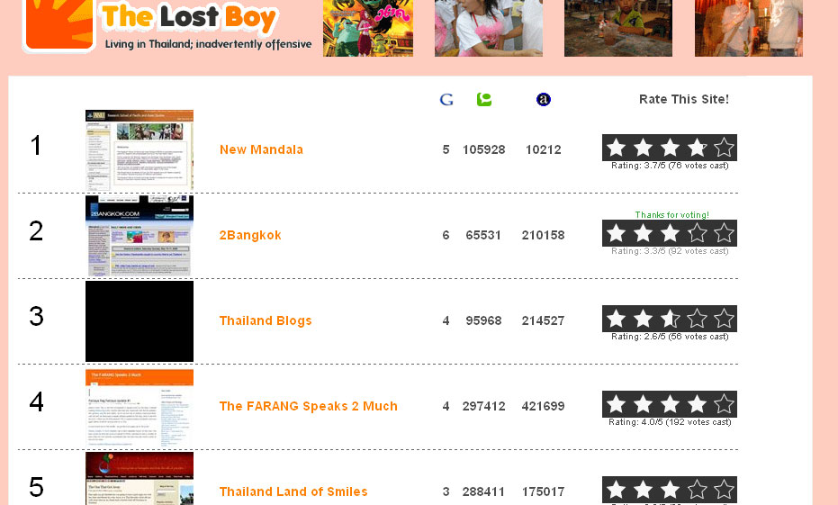 Whatismatt compiled the first decent list of the top 100 English blogs in Thailand. A nice idea, and good way to find out who's saying what, where. It's only based on people who click on the list, but the fact that it is compiled, is a great start.