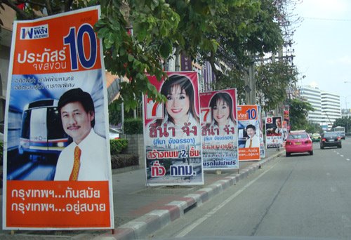 We've all seen the signs, during the election... but where do they all go once the election is over? Bangkok has quite a healthy industry of recycling for money. Garbage is picked thru most everywhere for ANYTHING of potential value. The recyclers or "salang" in Thai, are famous for cruising Bangkok streets with their modified 3 wheel pushcart-motorcycles. So as the polls close on 4pm on election day, it's gold rush time for the salang. They head out collecting the signs enmass. By nightfall, most signs have been scooped up. And monday morning, you'll be lucky to see any evidence of an election.